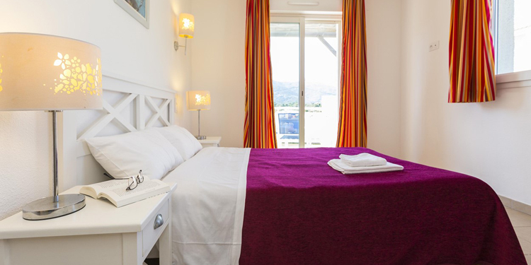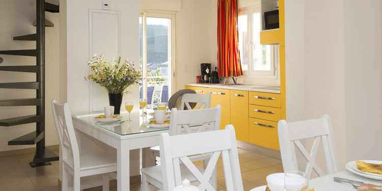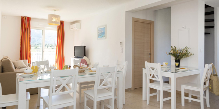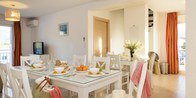 Quadrilocale 5/7 posti (circa 70mq): Soggiorno con divano letto. Due camere con letto matrimoniale ciascuna ed una cuccetta. Angolo cottura attrezzato (frigorifero, piastra in vetroceramica, microonde/grill, lavastoviglie). Sala da doccia con WC.